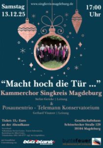 … unter diesem Motto lädt der Kammerchor SINGKREIS MAGDEBURG seine Gäste zum traditionellen vorweihnachtlichen Konzert in den Schinkelsaal des Gesellschaftshauses ein. Die bekanntesten deutschen Advents- und Weihnachtslieder werden vom Chor, einem Blechbläserensemble und auch gemeinsam mit dem Publikum musiziert. So werden alle in der Adventszeit in eine besinnliche und festliche Weihnachtsstimmung gebracht.